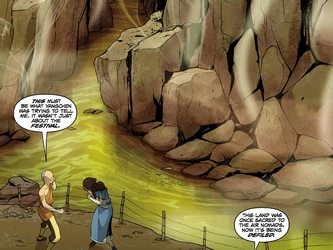 After the bowing ceremony, the group set out toward the meadow to enjoy their meal. Aang was appalled to learn, however, that a town with a large refinery had been built on the previously sacred grounds. Walking around through town, Aang spotted Yangchen's spirit once more and let it lead him to investigate together with Katara and the three Air Acolytes. He used his earthbending to help everyone over the refinery's fence, stating that they would not be trespassing as the fence was not supposed to be there. They discovered that the river running near the refinery was terribly polluted, causing Aang to conclude that the defiling of what was once sacred land was part of the reason why Yangchen had appeared to him. Before they could take any action, however, the refinery's guards appeared and tried to expel them from the factory's grounds. Aang used their appearance as another learning opportunity for the Air Acolytes by demonstrating how Air Nomads always try to avoid conflict unless absolutely necessary; he used his airbending to let the guards knock each other out.