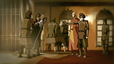 After landing outside Yu Dao, the team encountered a massive protesting crowd that included several members of the Freedom Fighters, who offered their services to the Avatar. To their disappointment, Aang explained his intention to talk to Zuko and flew with Katara over the walls on his glider. However, in the courtyard, several Fire Nation soldiers ordered Aang to leave and attacked, refusing to listen to the Avatar's attempts at peace. Aang sank their commander into earth while dodging the other troops, but one fireball set caused his clothing to catch fire, prompting Katara to intervene. She single-handedly defeated the remainder of the soldiers until she was halted by Zuko. Aang ordered the Fire Lord to let her go, and he responded by ordering the Avatar to leave. Using airbending, the Avatar separated the two, leading Zuko to retaliate. Aang entered the Avatar State, intent on fulfilling his promise, until Katara was able to calm him down. The Fire Lord advised that they talk, to which Aang agreed in comic frustration. Zuko led Aang and Katara on a tour of Yu Dao, explaining that the city had been heavily integrated for over a century, the firebenders and earthbenders having worked together to transform a small village into a world leader in metalworking, and also one of the great cities and that after seeing the townspeople living together peacefully, he could not separate them. Aang was adamant about restoring harmony to the four nations, but Zuko declined. Katara proposed hosting a meeting with Kuei, to which both the Avatar and the Fire Lord agreed.