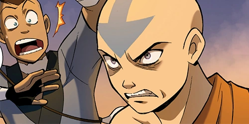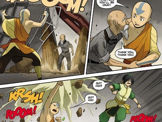 Aang's actions had been witnessed by Satoru, the refinery's engineer and interim boss while his uncle was away on business, who heartily greeted him. Aang wanted to talk to him about the ground the refinery was built upon, though after Toph and Sokka returned from their outing into town, the entire group was invited to attend the grand tour of the factory, during which Aang's attempts to strike up a conversation turned out to be futile. During the tour, Aang spotted Yangchen's spirit once more and received a vision of a rampaging monster, leaving him wondering whether it was a vision of the past or the future. His determination to talk to Satoru strengthened by the vision, Aang was finally able to tell Satoru that the refinery should never have been built on sacred grounds and accused it of being the culprit of the river's pollution. When Satoru refuted the accusation and Toph backed him up, Aang took Toph aside for a moment. He was under the impression that the only reason why she believed Satoru was due to a crush she had on him. Their talk rapidly evolved in a heated argument, however, during which the ground suddenly began to shake, causing their friends to assume that they were the cause of that. When a second earthquake occurred, Satoru asked them all to leave, although Aang offered to help clean of the mess the quake had caused. Before they could heed the engineer's request, they heard a factory worker call out for help, as the quakes had left him trapped under a haywire machine. Aang and Toph instantly set out to free the man and managed to rescue him due to teamwork. Afterward, the two friends reconciled, coming to the conclusion that Aang was too focused on holding on to the past, while Toph tried too hard to run away from it. At that moment, Loban and his business partner, Lao Beifong returned to the refinery, shocking Team Avatar.[56] Aang was appalled to hear Lao dismiss Toph as being a confused young woman, rather than his daughter.[57]