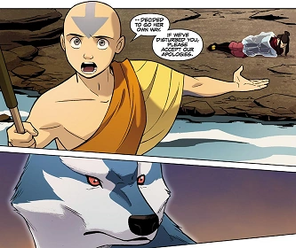 When they had caught up with the princess, Aang made his gruesome face again as the wolf spirit appeared as well. As the Avatar, he tried to reason with the spirit, apologizing for any possible disturbance, but to no avail as the spirit attacked. Aang implored his friends to take it easy with the spirit, specifically to avoid hurting it. When he tried to reason with the creature once more, the wolf snapped at him, prompting Appa to intervene and slam the spirit down with his tail. When Aang asked after the spirit's well-being, the entire group was attacked by a swarm of moth wasps the spirit had thrown up. They were eventually saved when Azula shot a lightning bolt away from them all, drawing the moths and the wolf spirit with it.
