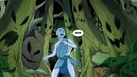 The next day, the team ventured into the forest, making their way to Forgetful Valley. Aang was appalled by Azula when the Fire Nation princess burned a piece of the forest in order to create a path, and he swiftly extinguished the flames with his earthbending. Before he could get into the issue, however, he picked up another presence like he had done before with the wolf, and his face changed accordingly. Sokka deduced that Aang was connecting with the animals and plants of the forest, as they all sported similar expressions as he was making. Aang spotted a flutter bat, who had exactly the same pattern on his wings as he had on his face, and followed it down to a round pond. Aang felt a spiritual calmness surrounding the water, sensing a resemblance to the Spirit Oasis at the North Pole, and asked everyone to be respectful. However, Azula disregarded his request and fired a lightning bolt straight into the pool, believing that her mother was there. Soon after, the group was attacked by plants and vines, though the skirmish was cut short as Katara deduced the attackers to be waterbenders and forced them to reveal themselves.