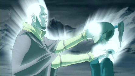 At age forty, Aang's energybending skills had progressed, as he was able to strip Yakone's bending abilities almost immediately with minimal effort, unlike when he stripped Ozai's bending.[65] He also demonstrated the ability to restore a person's bending, as seen when his spirit appeared before Korra and restored her bending abilities that had been taken by Amon's bloodbending. At the same time, Aang imparted the knowledge of energybending and control of the Avatar State onto Korra.[68]