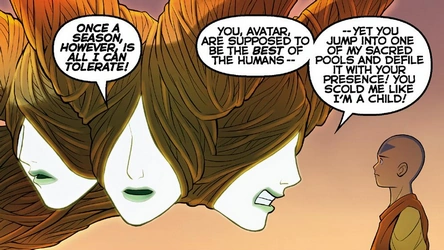 Aang managed to successfully summon the Mother of Faces to the Spirit World, but she would only allow the group one request. Zuko said to Aang that Misu should be allowed to use this request to grant Rafa a new face. Aang apologized, saying they would keep looking for Ursa on their own. However, Azula interrupted Misu and instead requested information about Ursa, causing her to return to Hira'a to confront her mother, Zuko and Sokka chasing her. Aang said that they had to help, though Katara wondered if they should help Zuko and Sokka, or Misu, who was waterbending at the Mother of Faces to convince her to stay. After the ancient spirit chastised Misu for bending her sacred pool's water, the Avatar tried to convince the Mother of Faces that Misu meant no disrespect, but she re-submerged anyway. Aang dove into the pool, trying to pursue her while dodging spirit animals. Unable to find her, the young Avatar wondered how could the spirit be so cruel, and upon this, was ejected from the pool, Katara rushing to his aid. The Mother of Faces re-emerged, denouncing humans for having turned her into their slave and declaring her work "inadequate". Aang tried to tell her that they did not mean this, but the spirit continued her rant, scolding him for defiling her sacred pool and talking down to her as if she were a child, before calling all humans "selfish, shortsighted, [and] insolent". She told Aang and his group to leave, sending her spirit animals to attack them.