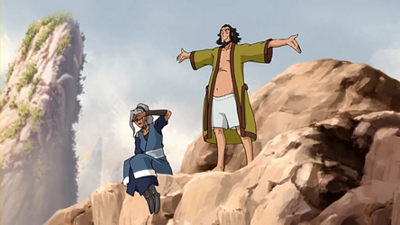 Traveling far from the temple, Bumi briefly played a prank on Tenzin by pretending to be Ikki hiding in a bush. As Kya rejoined them, Tenzin wondered where he had gone wrong with his children. Kya believed this to be because Tenzin let his duties get in the way of being a father, remembering that Aang was exactly the same way, only for Bumi to squeeze Tenzin's cheeks and say that Aang always had time for the airbender. Tenzin brushed him off, insisting that their father loved them all equally and asked why they were even discussing things long past. After Tenzin ran off, both Kya and Bumi mocked him for running away in the "typical airbender" style.