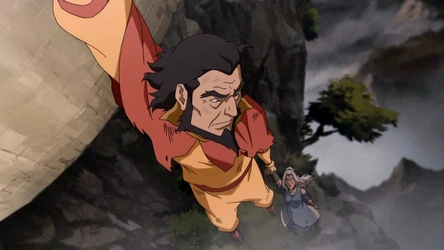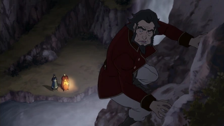Bumi faced off with Ghazan and was largely on the defensive, trying to dodge the lavabender's attacks. At one point, he was surrounded by lava and was barely able to get out of the way of a final blow with his airbending. After using it to fire himself off a wall and behind Ghazan, Bumi jumped on his foe, pulling his hair and biting his shoulder before being launched off with a small pillar of earth by an enraged Ghazan. He and Kya found themselves cornered and forced backward as Ming-Hua and Ghazan relentlessly attacked. When Ghazan used his bending to push the siblings off the edge of the temple, Bumi used his bending to momentarily break their fall and thus allow him to grab on to another ledge while grasping Kya. P'Li soon approached them on the Red Lotus' airship and prepared to attack, prompting Kya to advise Bumi to let go. The airbender did not want to, fearing death, only to be told by his sister they would suffer the same fate if they held on. Just before a combustion beam hit the siblings, Bumi let go and the two fell a significant distance down the mountain, leaving them unconscious.[20]