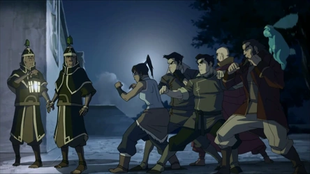 After finding out that the airbenders were being held underneath the Earth Queen's Temple, the group discussed what they could do to free them. Bumi suggested that they infiltrate the temple at night with two insertion teams and a third on the outside. However, he impractically suggested that they would need twelve tons of blasting jelly, a medium-sized bulldozer and a badgermole who knew Morse Code. Their party was soon joined by Lin Beifong, who had come to warn Korra that Zaheer, Ghazan, Ming-Hua, and P'Li were hunting her, and insisted that she return to Republic City, but instead joined their effort when Korra retained her desire to free the airbenders.