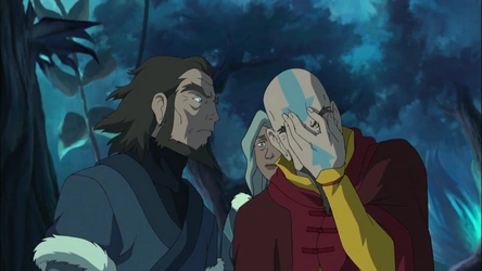 As night fell, Bumi recounted a search-and-rescue operation he had performed outside of Ba Sing Se, which only irritated his brother, who criticized his embellishing regarding facing three typhoons. Bumi defended that he was only trying to inspire him. Soon after, Kya found footprints leading down the mountain, but instead of following those tracks, Bumi insisted they make their way down the waterfall, convinced that the faster route would be no trouble for benders. His siblings, however, upstaged him by effortlessly making it down to the bottom with their bending. Though Tenzin offered to air lift him down, Bumi refused his help, only to slip and fall into the water. Kya began to heal his head injury and chastised him for failing to accept that he could not do everything a bender could. Bumi disregarded her words, insisting that she was not their mother, prompting Kya to stop healing him and let the water splash on his head. Bumi attempted to turn to Tenzin for support, but his younger brother retorted that he had always been the most childish, whereas he had to be the responsible one. Kya took offense to the remark, stating that only she was willing to move to the South Pole to support their mother after their father had died. Tenzin defended that he had the responsibility of carrying on the traditions of the Air Nomads, but his siblings retorted that he should not be carrying the burden alone, since they are also Aang's children and started regretting joining him on this vacation. Tenzin confessed that he never wanted to bring them along in the first place and told them to return to the temple in case Ikki had returned while he continued searching.[7]