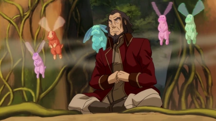 Bumi, surrounded by dragonfly bunny spirits, watched Tenzin perform an ancient cleansing technique to strengthen a meditation circle's connection to the Spirit World.