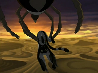 After Appa's disappearance in the Si Wong Desert, Momo was captured by a buzzard wasp, but was rescued quickly by Aang, who viciously knocked the creature out of the sky with an air whip, bitterly refusing to lose another friend.[14]