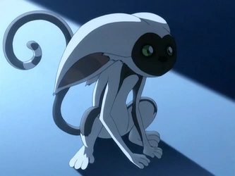 While visiting the Southern Air Temple in late 99 AG, Avatar Aang, Katara, and Sokka heard a strange noise from the doorway of the sanctuary of the temple, indicating that someone had entered the room.[2] Afraid that it was a firebender, they hid behind two Avatar statues, only to discover that the intruder was just a lemur. Aang took interest in him and longed to adopt him as his new pet; in contrast, a desperately hungry Sokka wished to eat their newly discovered companion for dinner. A chase ensued between Sokka and Aang, which ultimately led Aang to discover Monk Gyatso's corpse. Afterward, the lemur provided Sokka with a quantity of food. Aang decided to keep the lemur as a pet and named him "Momo" after he stole a moon peach from Sokka.[2] From this moment on, Momo remained a constant addition to their family, accompanying the team on their journeys throughout the world.