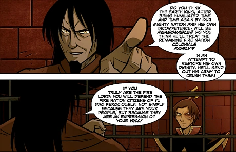 When Zuko returned with more tea, Ozai explained to him that the lesson to be learned from the memory was that there was no wrong or right in the world, as whatever the Fire Lord decided to do, was right by definition. When Zuko refused to see this and was set on going through with the peace talks with the Earth King, Ozai predicted that they would fail as the previously weak Earth King would be set on showing the world that he could be a strong and decisive ruler by leading his armies to the gates of Yu Dao. Zuko rejected Ozai's predictions again, which led the former firebender to the conclusion that Zuko trusted the Avatar more than he trusted himself. Sickened by this display of weakness from his own son, he demanded that Zuko leave his presence.[1]