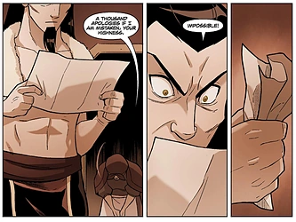 Afterward, Ozai went down to Ursa's quarters and confronted her about the letters she had sent Ikem, reminding her that she was supposed to forget her old life and that any communication with her past life was treasonous. Even though he deemed Zuko to be evidence of her treacherous act, he stated he would not kill the boy, proclaiming himself to be merciful. However, he took pleasure in informing his wife that he had sent an assassin after Ikem and that he had been successful, breaking her heart.[10] When Ursa told Ozai that Zuko was indeed their son, Ozai replied that he had already known that, as he had sent spies to keep an eye on Ursa months before their wedding, but was angry as to why she would write such an obvious lie. When Ursa replied that she wished for Zuko not to turn out like Ozai, the prince said he would be sure to treat their son like that "of a treacherous dog", and every time he would wound Zuko with harsh words, he would be "fulfilling his mother's wish".[12]